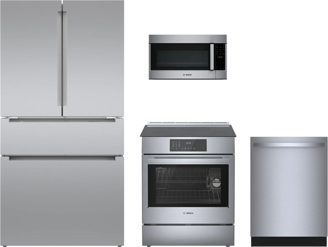 Bosch 4 Piece Stainless Steel Kitchen Package with French door refrigerator, built in dishwasher, slide in induction range and over the range microwave.Read More